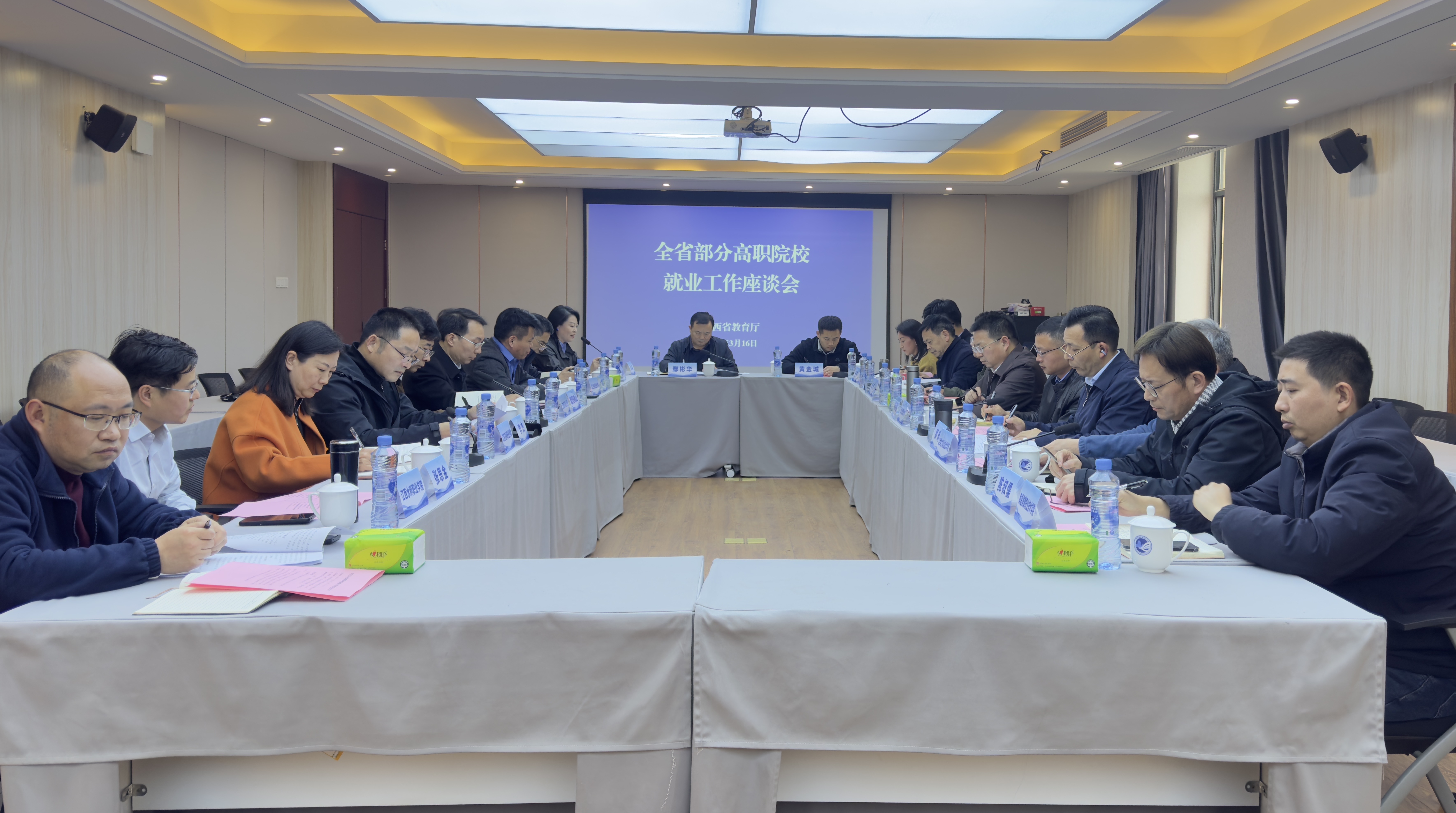 3月16日下午,全省部分高职院校就业工作座谈会在我校产教融合大楼6楼会议室召开。江西省教育厅评估院就业中心主任鄢彬华主持会议并讲话,来自全省10所高职院校的分管就业工作校领导、就业部门负责同志及省教育厅就业专班同志参加会议。