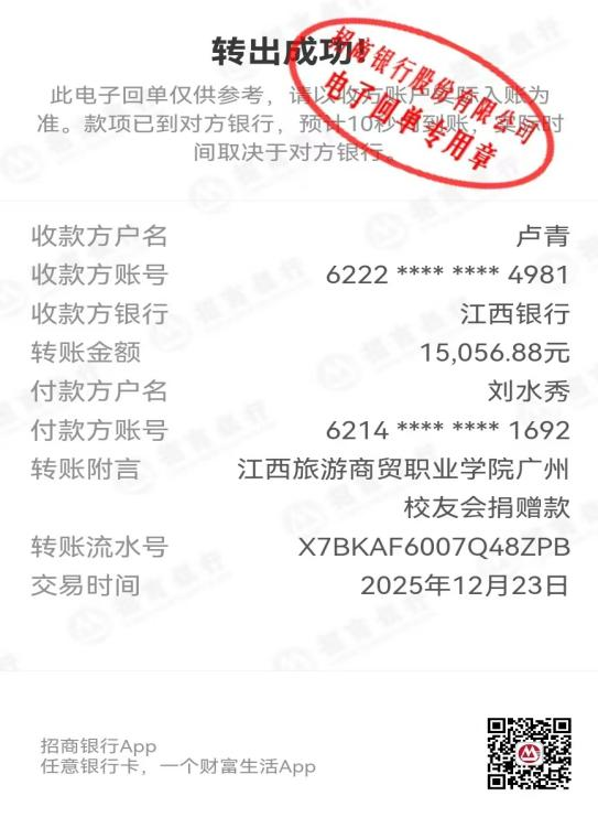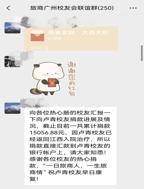 此次帮扶行动,充分彰显了广州校友联谊会“服务校友、凝聚友情、传递温暖”的核心宗旨,更展现了其强大的组织协调能力与责任担当。同时,也让我们看到了旅商校友间守望相助、同心致远的深厚情谊,衷心感谢每一位慷慨解囊、传递爱心的校友,愿卢青携这份暖意积极治疗,早日康复。