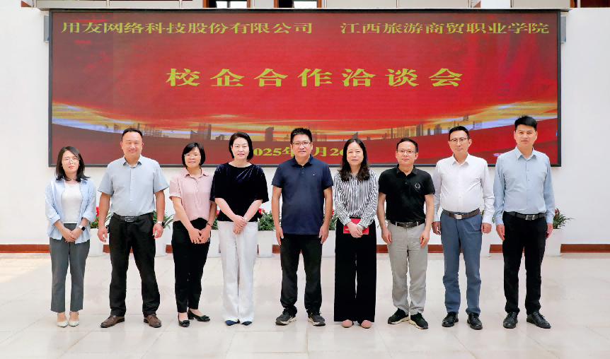 2025年5月26日,我校与用友网络科技股份有限公司召开合作洽谈会。学校党委副书记、校长廖国琼,党委委员、旅游学院院长张蕾,用友新道江西分公司总经理丁立波、江西威特科技有限公司董事长唐建民等校企代表出席会议,学校产教融合处、会计金融学院负责人及相关工作人员参会。