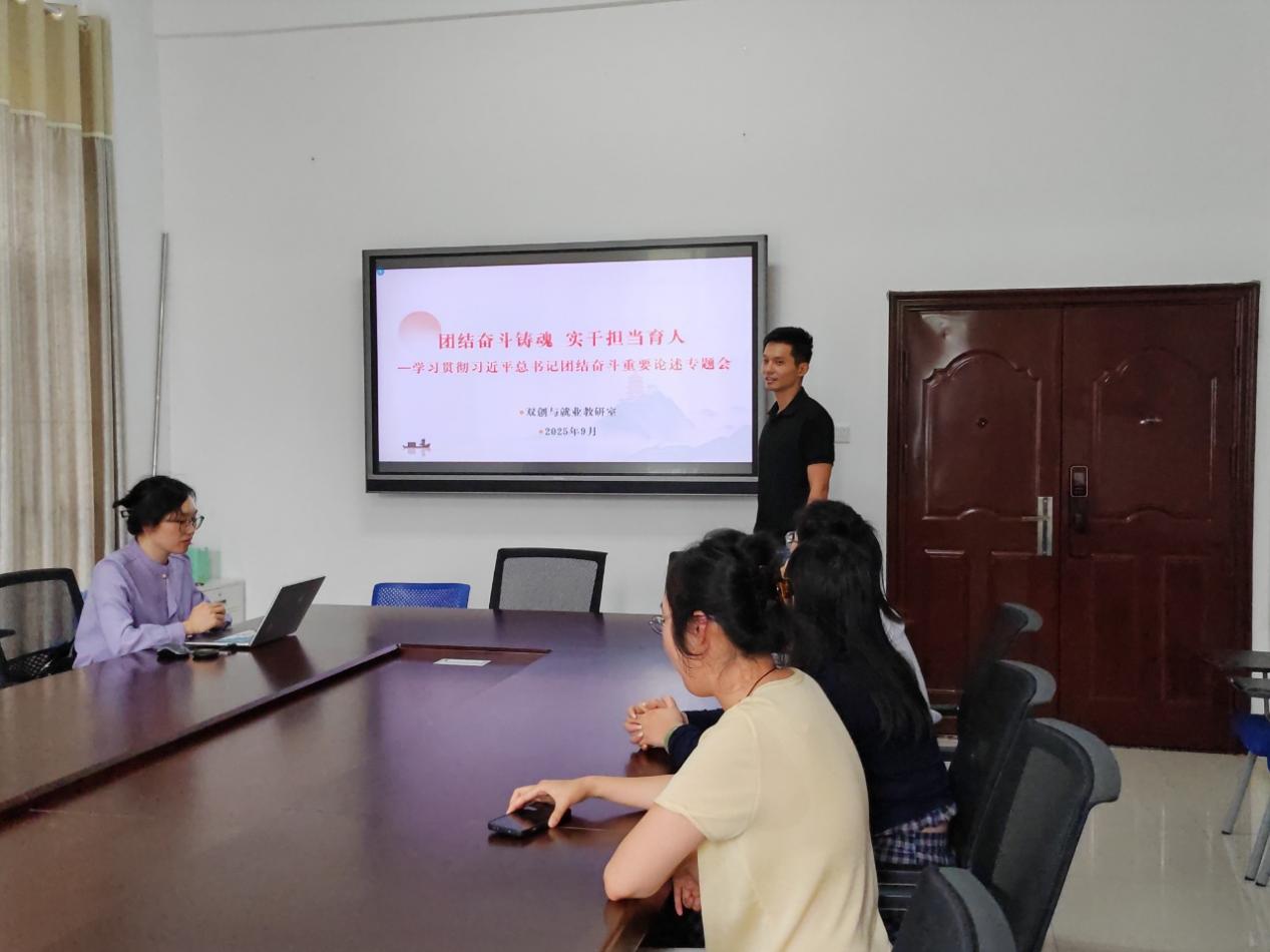 9月24日,双创与就业教研室组织全体专职教师召开专题会议,学习“团结奋斗铸魂 实干担当育人—学习贯彻习近平总书记团结奋斗重要论述”。