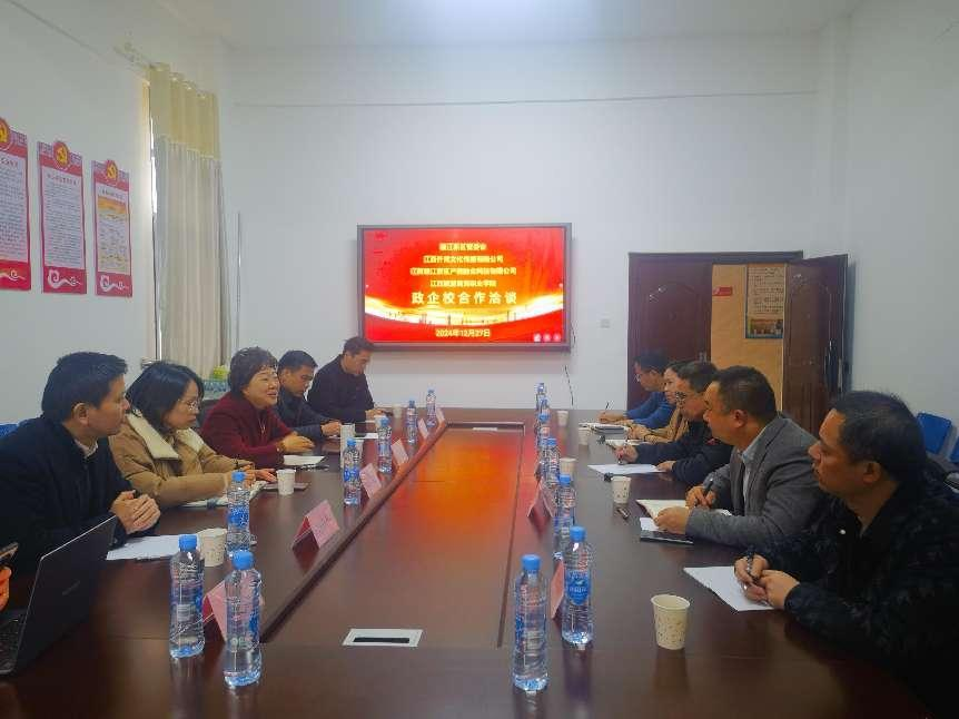 为了推进政企校合作,加快数字贸易产业学院建设,2024年12月27日上午,赣江新区创新发展局二级调研员万红梅携江西仟得文化传播有限公司和江西赣江新区产教融合科技有限公司相关工作负责人一行6人来校洽谈。学校党委委员、副院长杨福盛,产教融合处、各二级学院相关负责人参加洽谈。