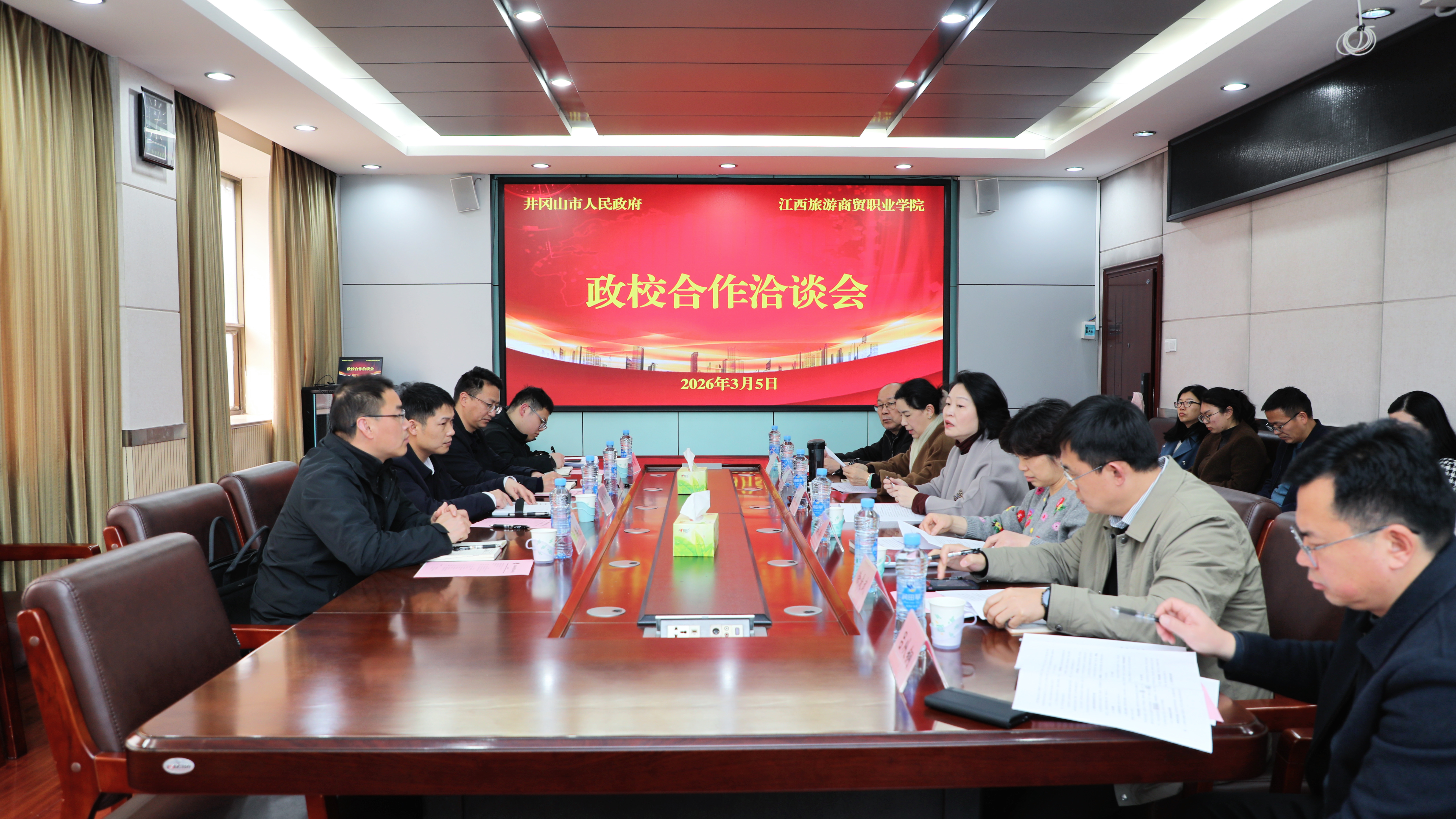 2026年3月5日,学校与井冈山市人民政府举行政校合作洽谈会。井冈山市人民政府党组成员、副市长沈志魁,市教体局党组书记、局长马式铭等一行4人;学校党委委员、旅游学院院长张蕾,产教融合处等相关职能部门及二级学院负责人参会,会议由张蕾主持。